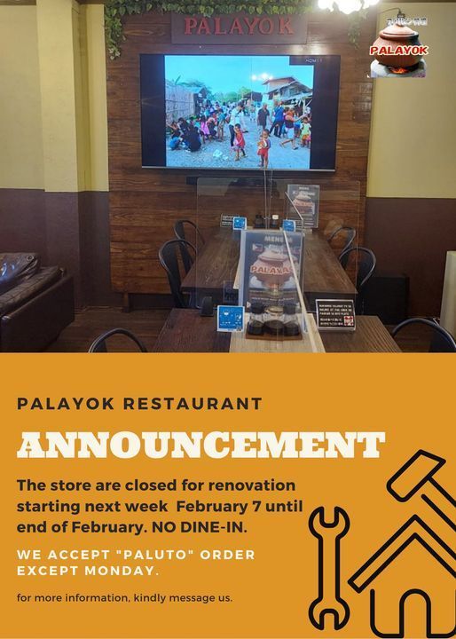 PLEASE BE ADVISED FOR THIS COMING WEEK FEBRUARY 7 UNTIL END OF THE MONTH FOR PALAYOK STORE RENOVATION.